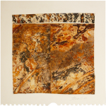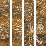 Der Oxydationsverlauf auf Folien unterscheidet sich deutlich von dem auf Textilien. Er erinnert eher an Aquarelle und ist noch mehr dem Zufallsprinzip unterworfen. Aber auch da spielt die Art der Folie eine Rolle, und dementsprechend unterschiedlich fällt das Ergebnis aus. Meistens arbeite ich auf transparenter Folie, diese wird von mir zu ganz unterschiedlichen Bildobjekten verarbeitet.