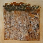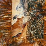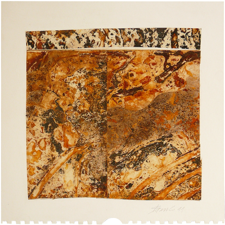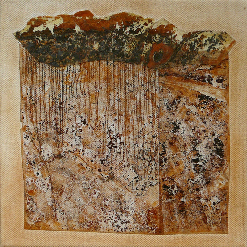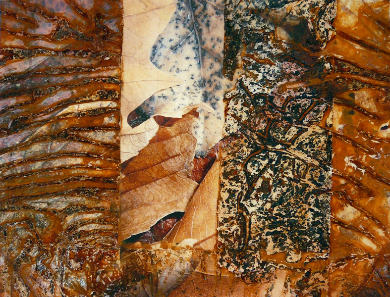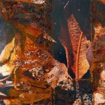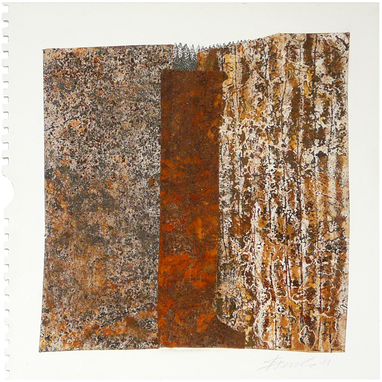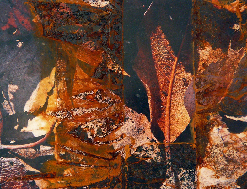 Es gibt Arbeiten, da wird die Rostfolie mit Fotos von Laub oder morbider Bausubstanz collagiert. Beides Zerfallsprodukte, die sich hervorragend in mein Thema einreihen lassen.